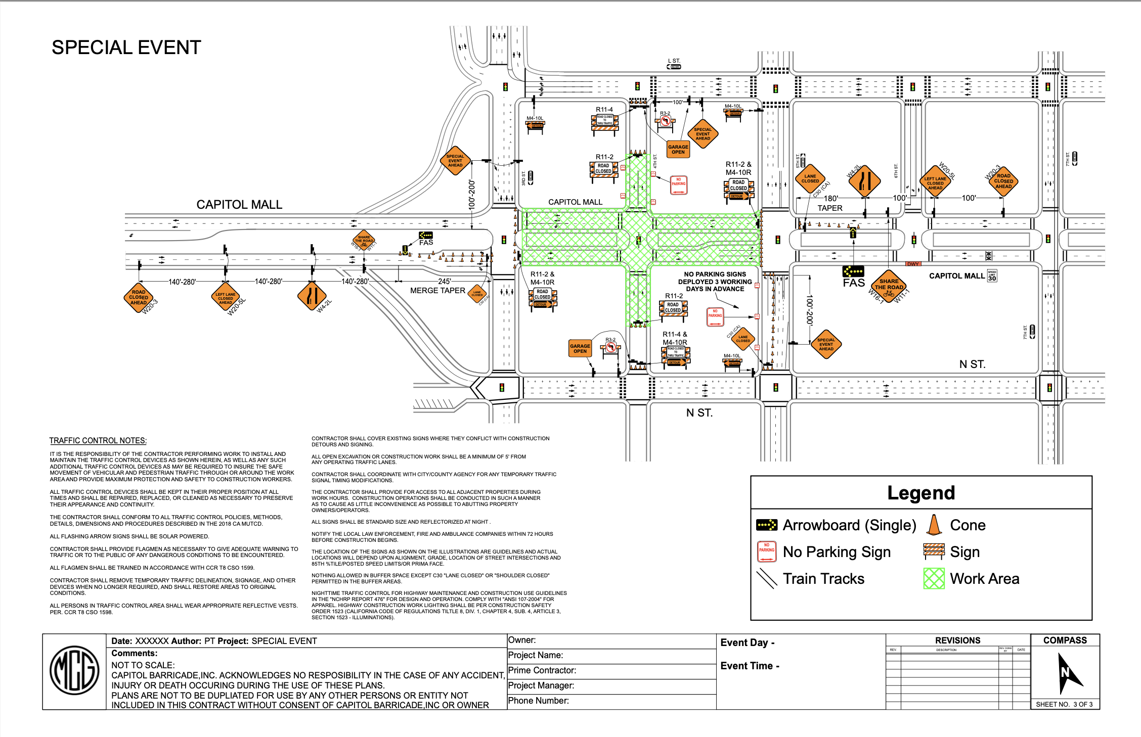 Work Zone Protection: Specific measures to protect construction workers and equipment, including barrier placement, warning signs, and flagging operations when necessary.